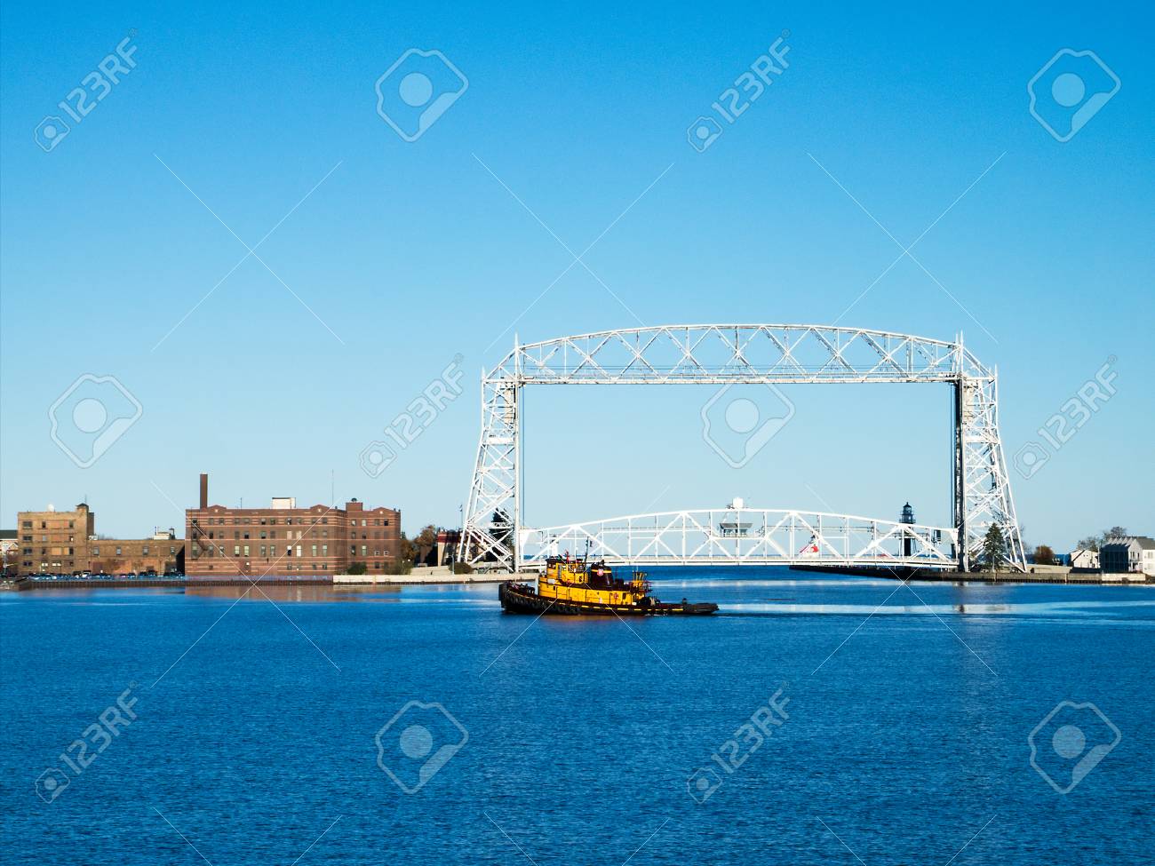 Yellow Tug Boat Sails Near Duluth Minnesota Aerial Lift Bridge